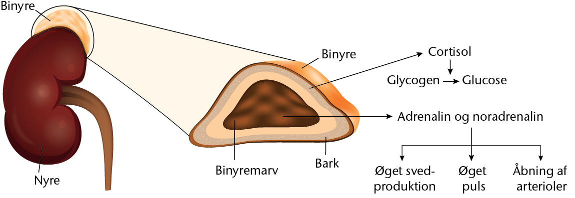 Hormonsystemets reaktion på fysisk aktivitet. Via det sympatiske nervesystem fremmes udskillelsen af adrenalin og noradrenalin der påvirker de indre organer. Desuden øges udskillelsen af cortisol som fremmer omdannelsen af glycogen til glucose. Alle disse reaktioner tilpasser kroppen til fysisk arbejde. Tilpasningerne kaldes også ‘kamp-eller-flugt-reaktioner’.