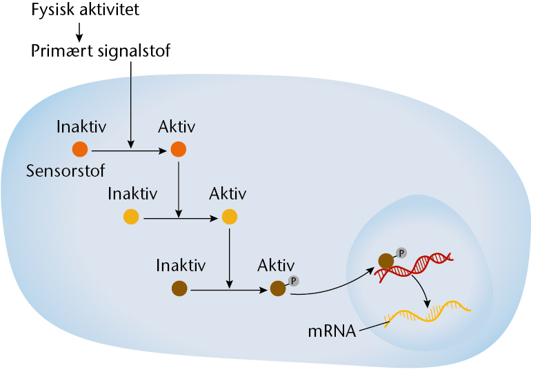 Signalkæder. Fysisk aktivitet igangsætter signalkæder. Pga. den fysiske aktivitet opstår der stoffer, eller ændrede koncentrationer af stoffer, som fungerer som primære signalstoffer. Disse registreres af sensorstoffer der igangsætter en signalkæde, som altså ender med at aktivere bestemte gener i cellekernen og dermed dannelsen af bestemte proteiner.