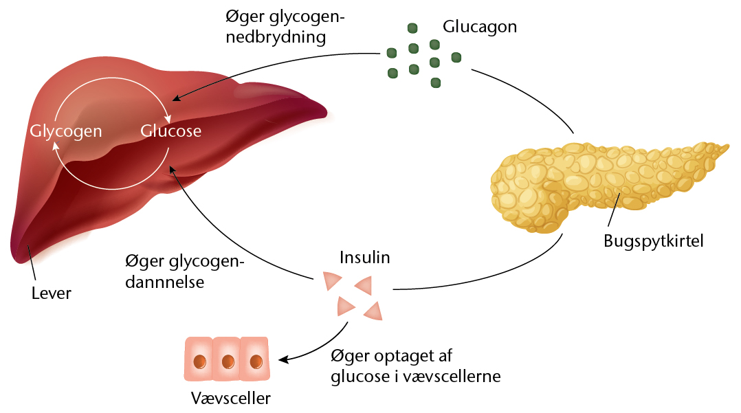 Hormonerne insulin og glucagon er modsatvirkende og regulerer blodglucosen. Insulin sænker koncentrationen af glucose i blodet, dels ved at glucose i leveren omdannes til glycogen, dels ved at glucose optages i kropsceller, primært i muskelfibre. Glucagon øger koncentrationen af glucose i blodet ved at glycogen spaltes til glucose i leveren.