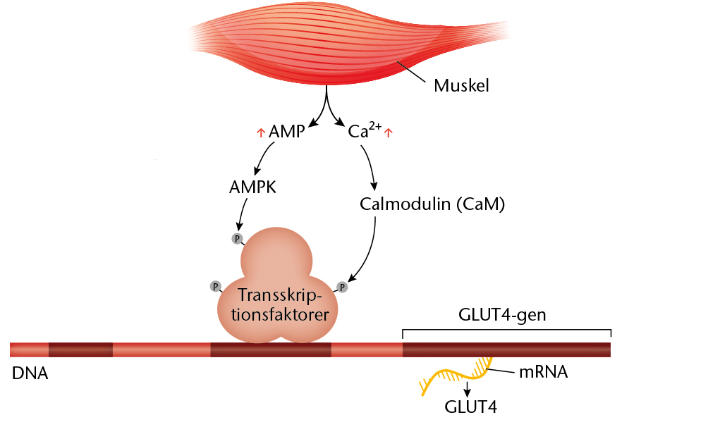 Kontraktions-induceret aktivering af GLUT4-genet. Muskelkontraktioner øger koncentrationerne af AMP og calcium-ioner, hvilket starter signalkæder som øger transskriptionen af GLUT4-genet.