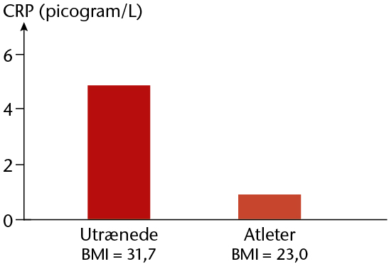 CRP-koncentrationen i blodet hos hhv. utrænede overvægtige, og udholdenhedstrænede atleter. Picogram er 10-12 g.