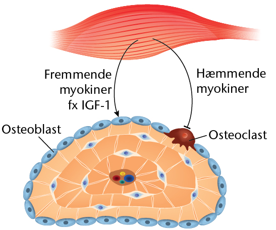 Myokiner, som dannes i musklerne ved fysisk aktivitet, kommer via blodet til knoglerne, hvor de påvirker knogledannelsen. IGF-1 er et af de myokiner der fremmer knogledannelse.