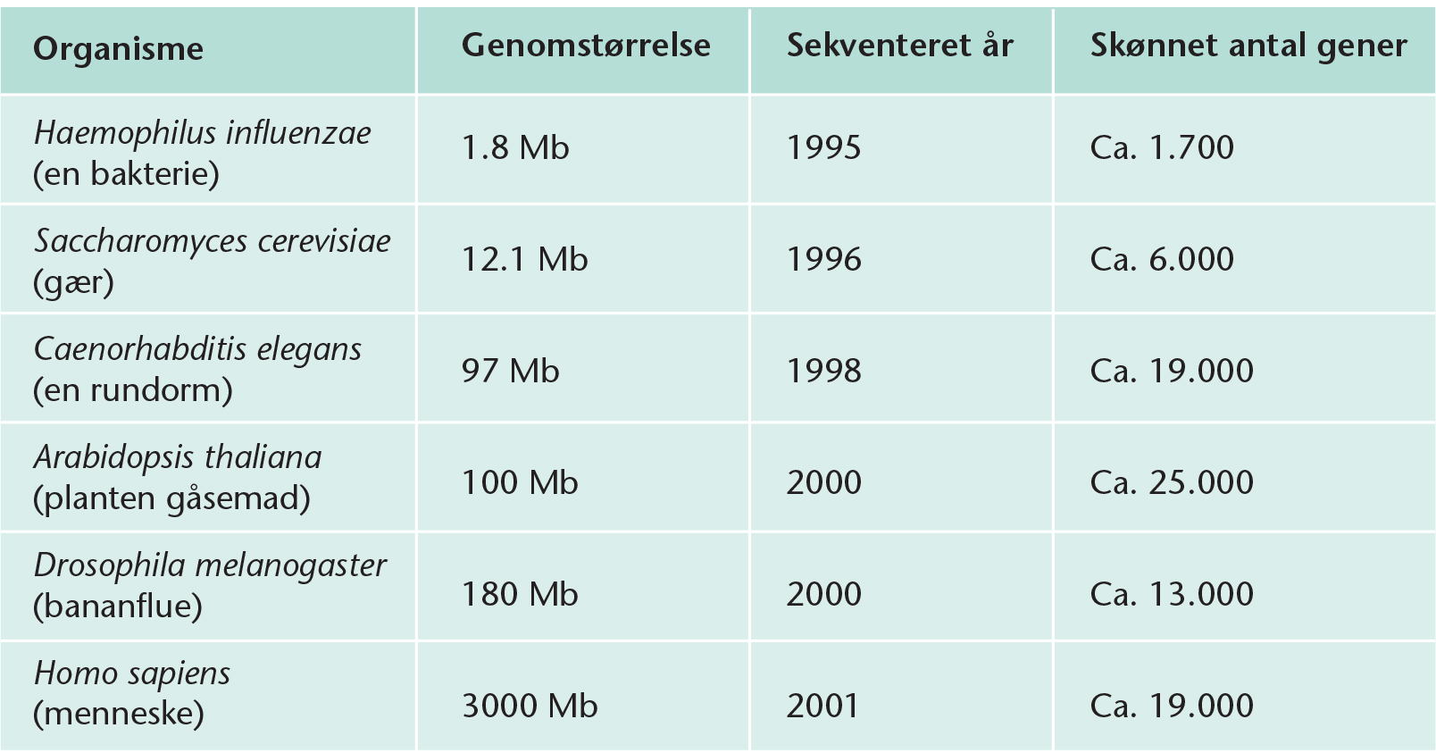Eksempler på sekventerede organismer.