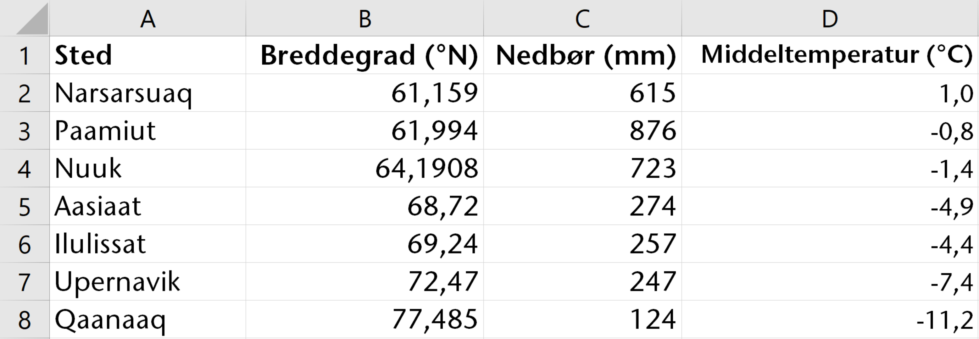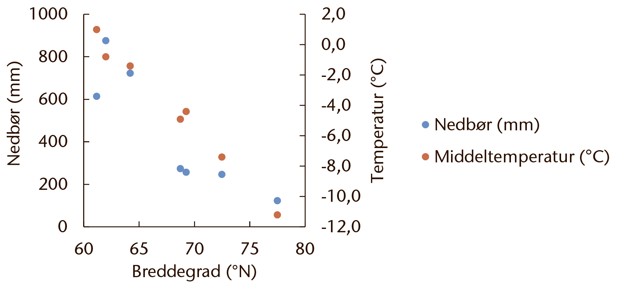 Graf det viser sammenhængen mellem breddegrader og hhv. nedbør og middeltemperatur.