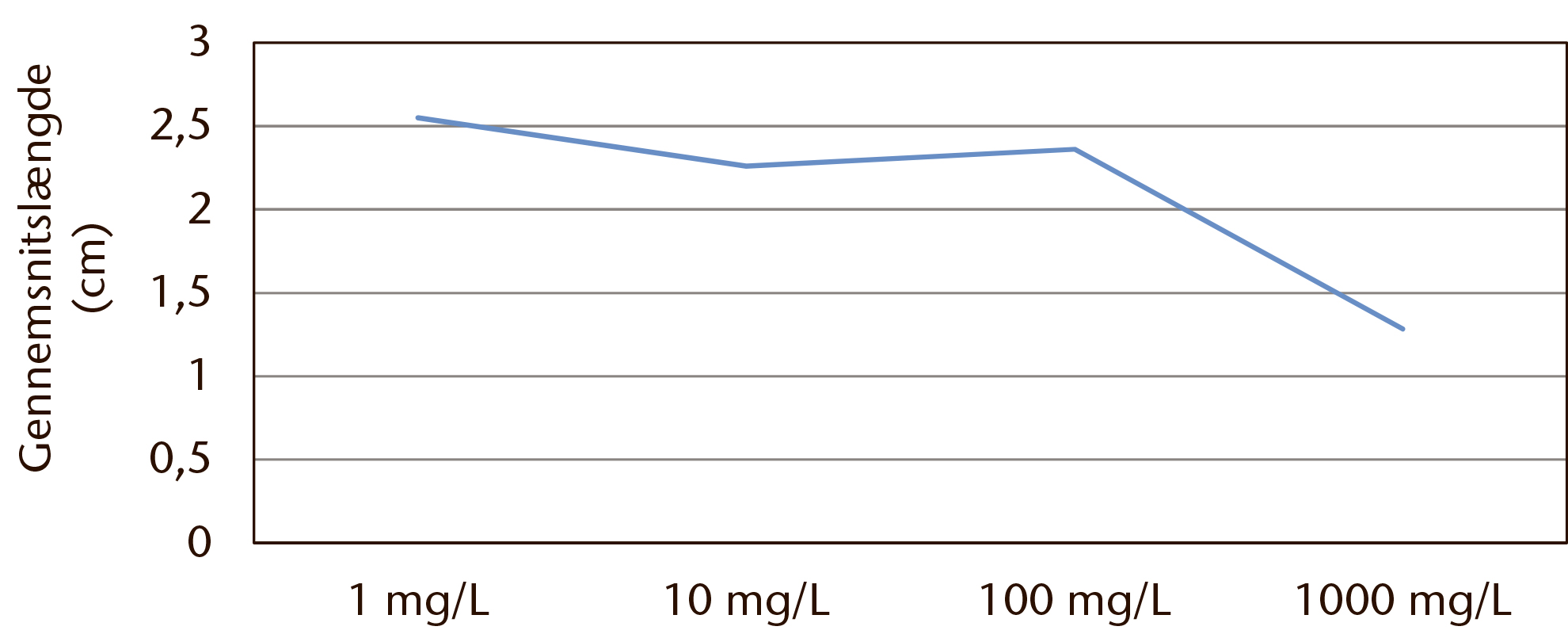 Gennemsnitslængde af karse som funktion af kobber(II)-sulfatkoncentratioerne. Forket graf.