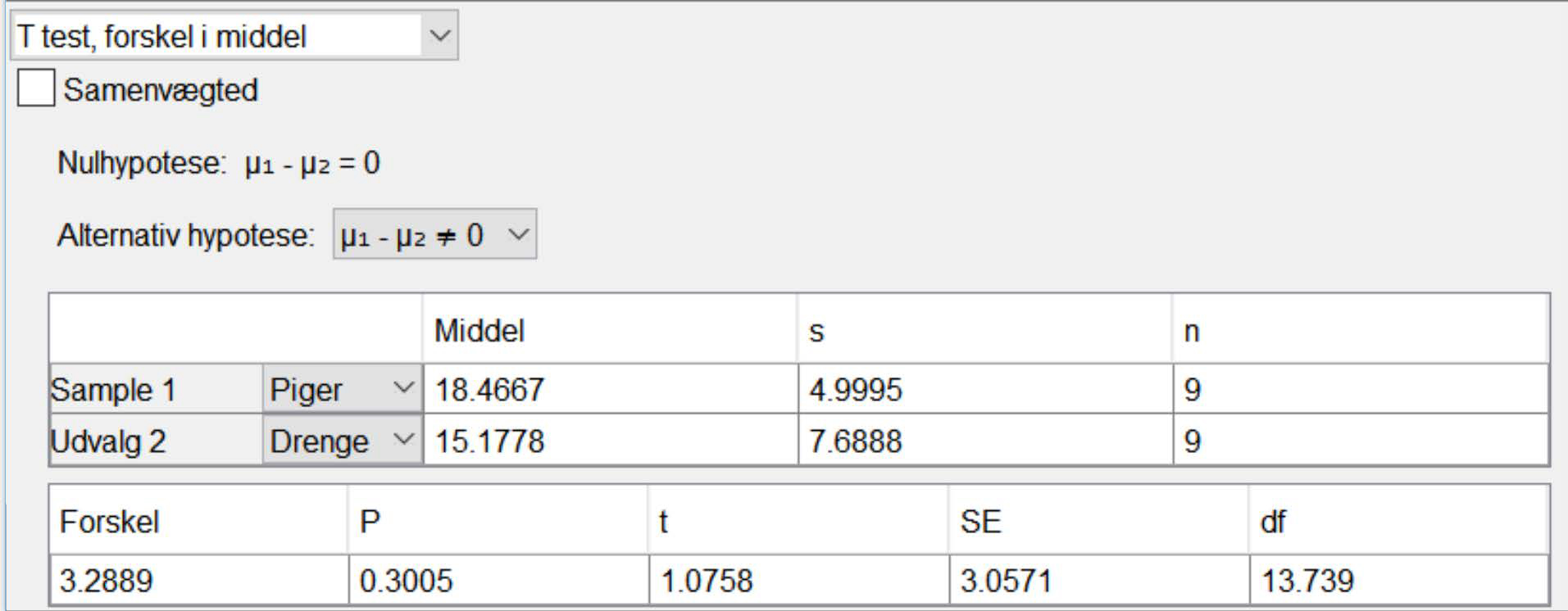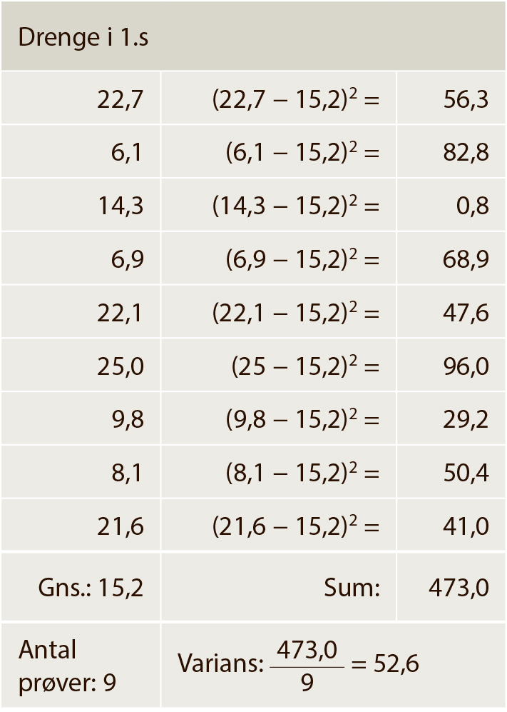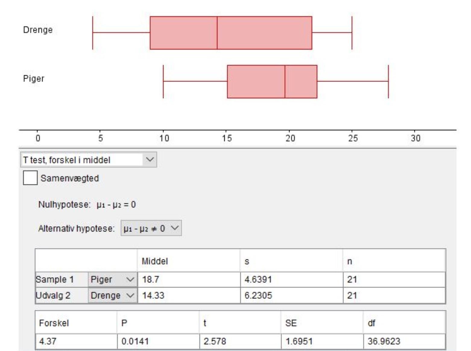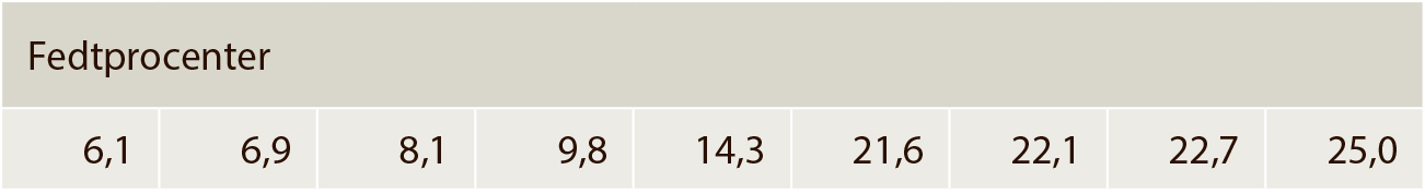 Tabel over fedtprocenter i to klasser fordelt på køn.