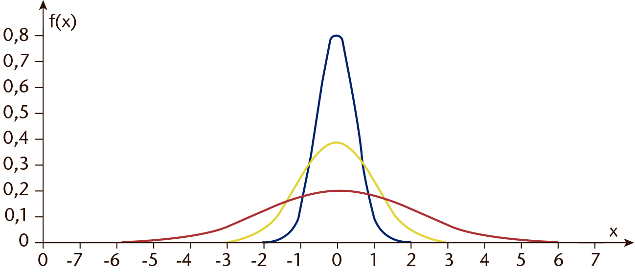 Kurver der viser normalfordeling med samme middelværdi (0), men med forskellig spredning.