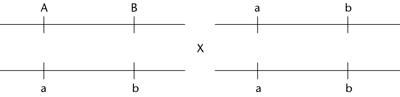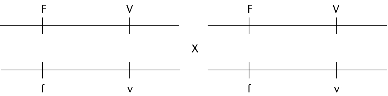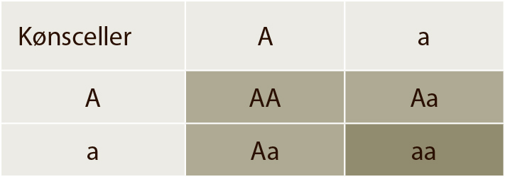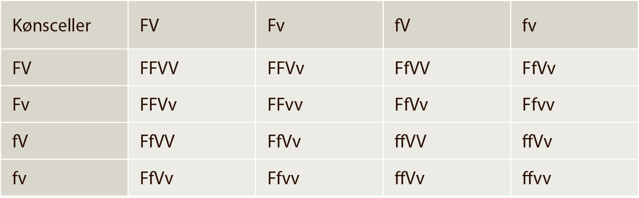 Krydsningsskema for mulige genotyper når to dobbelt heterozygote krydses.