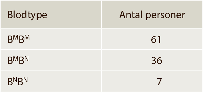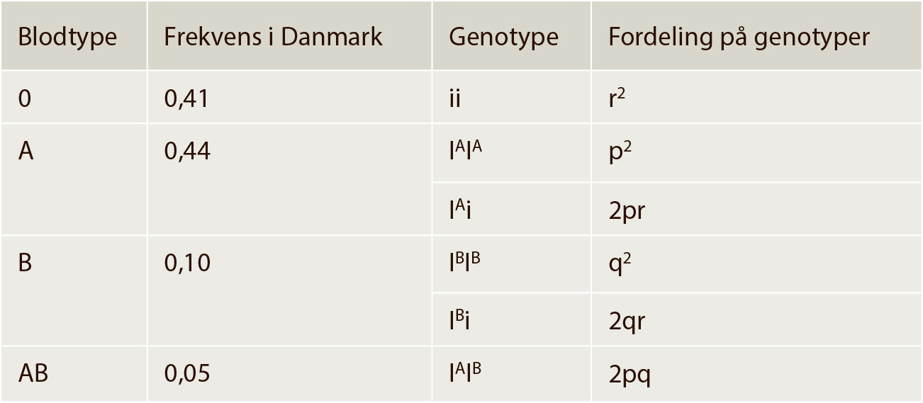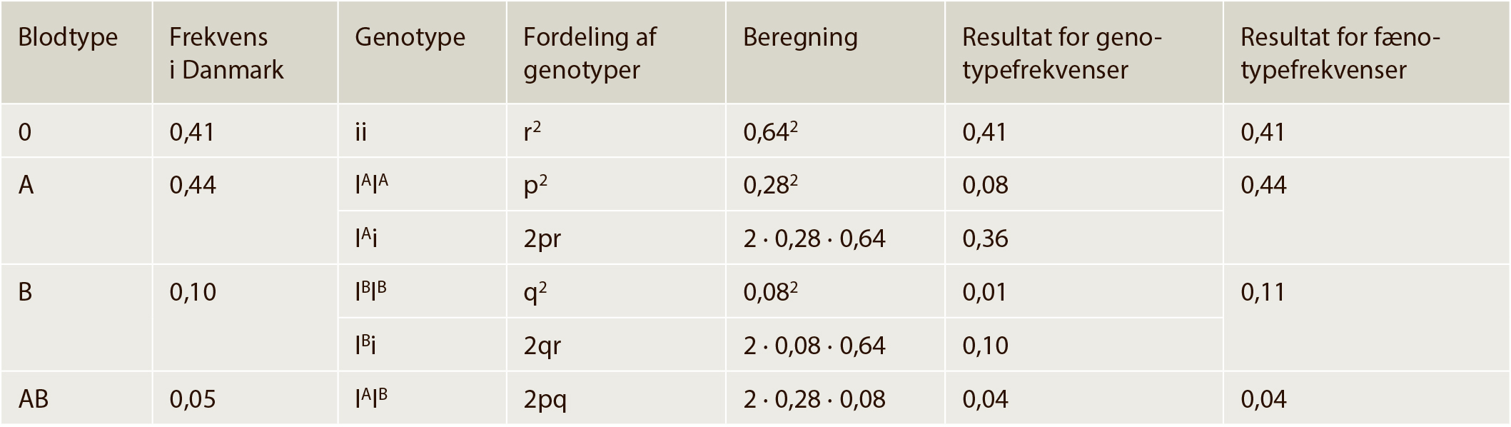 Den fænotypiske fordeling af AB0-blodtyper i Danmark samt deres beregnede fordeling af genotyper.