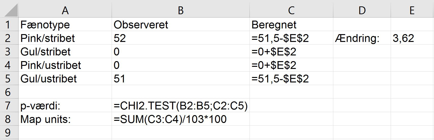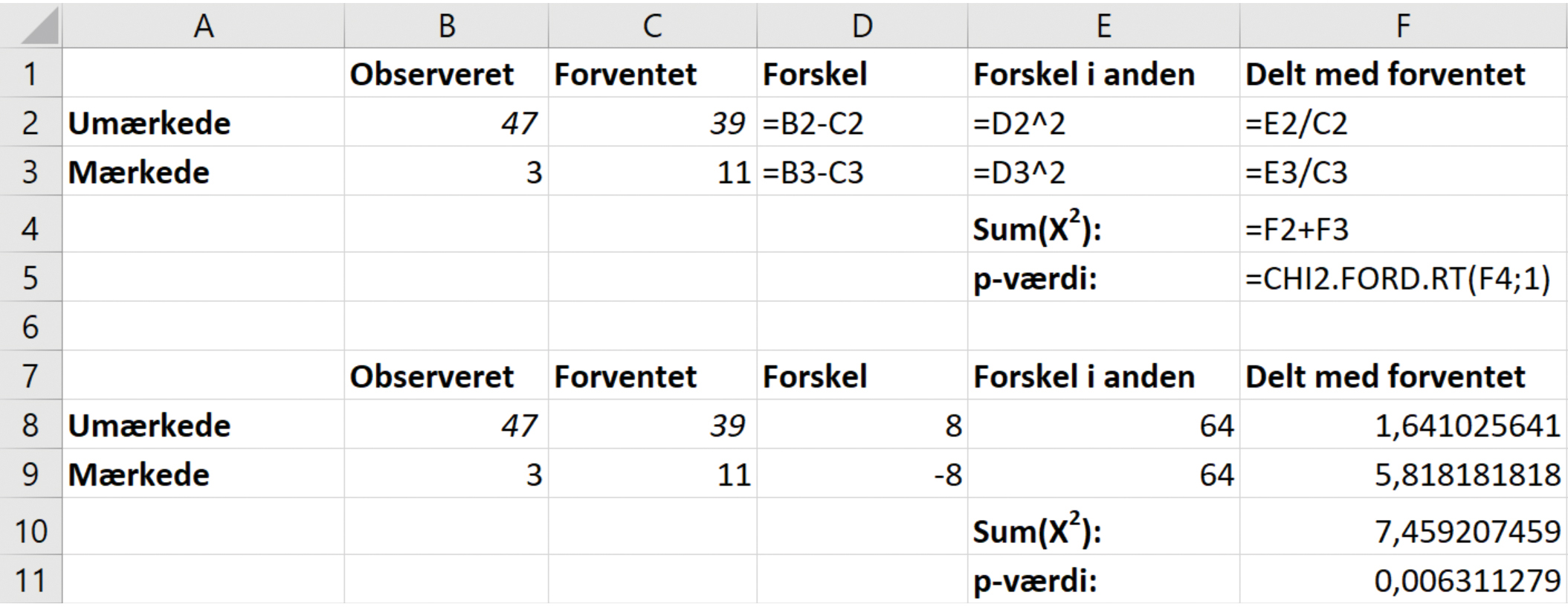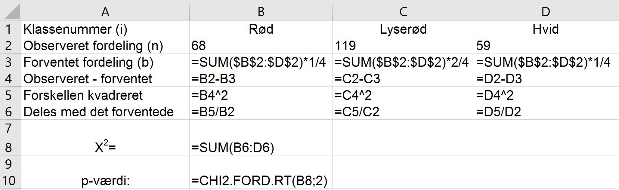 Beregning af X2-værdi og p-værdi for at teste om den fundne fordeling passer.
