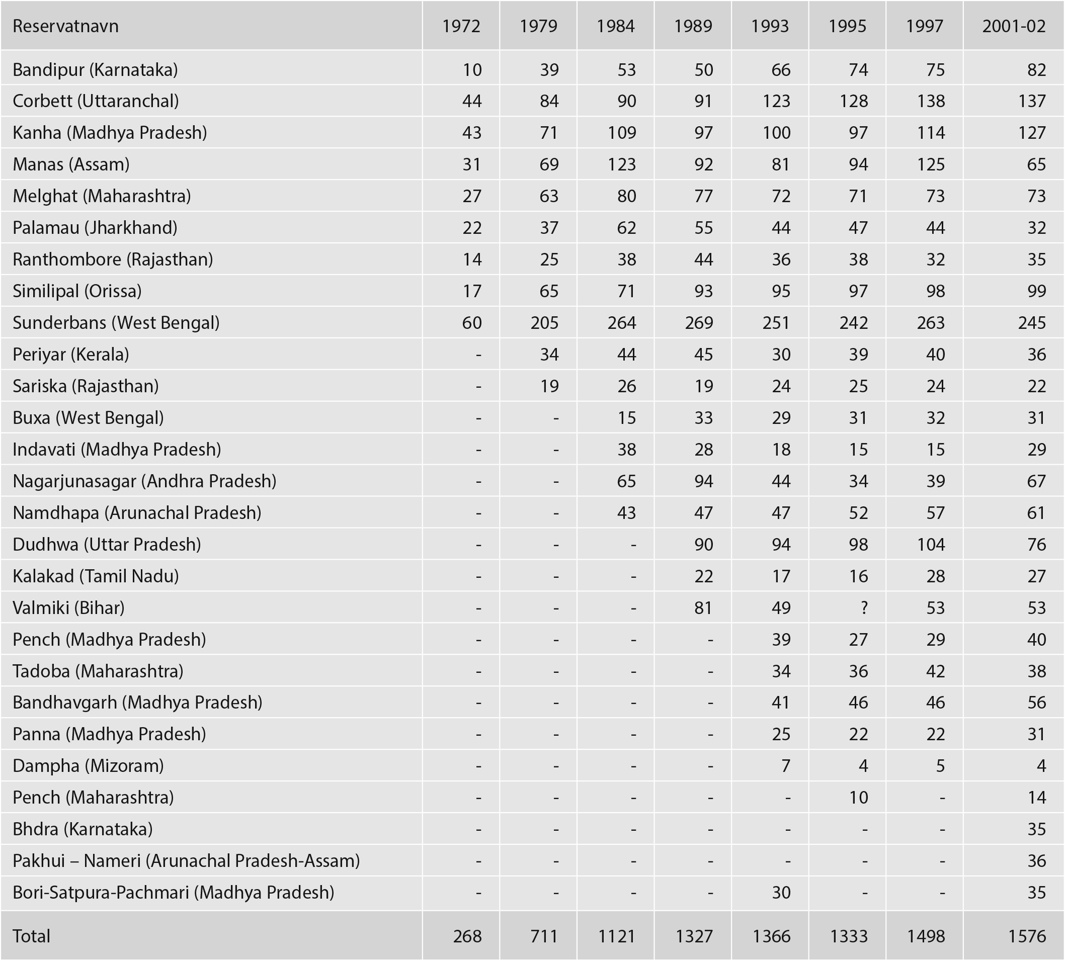 Tabel over reservater i Indien og antallet af tigre i reservaterne.