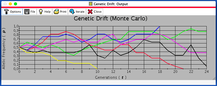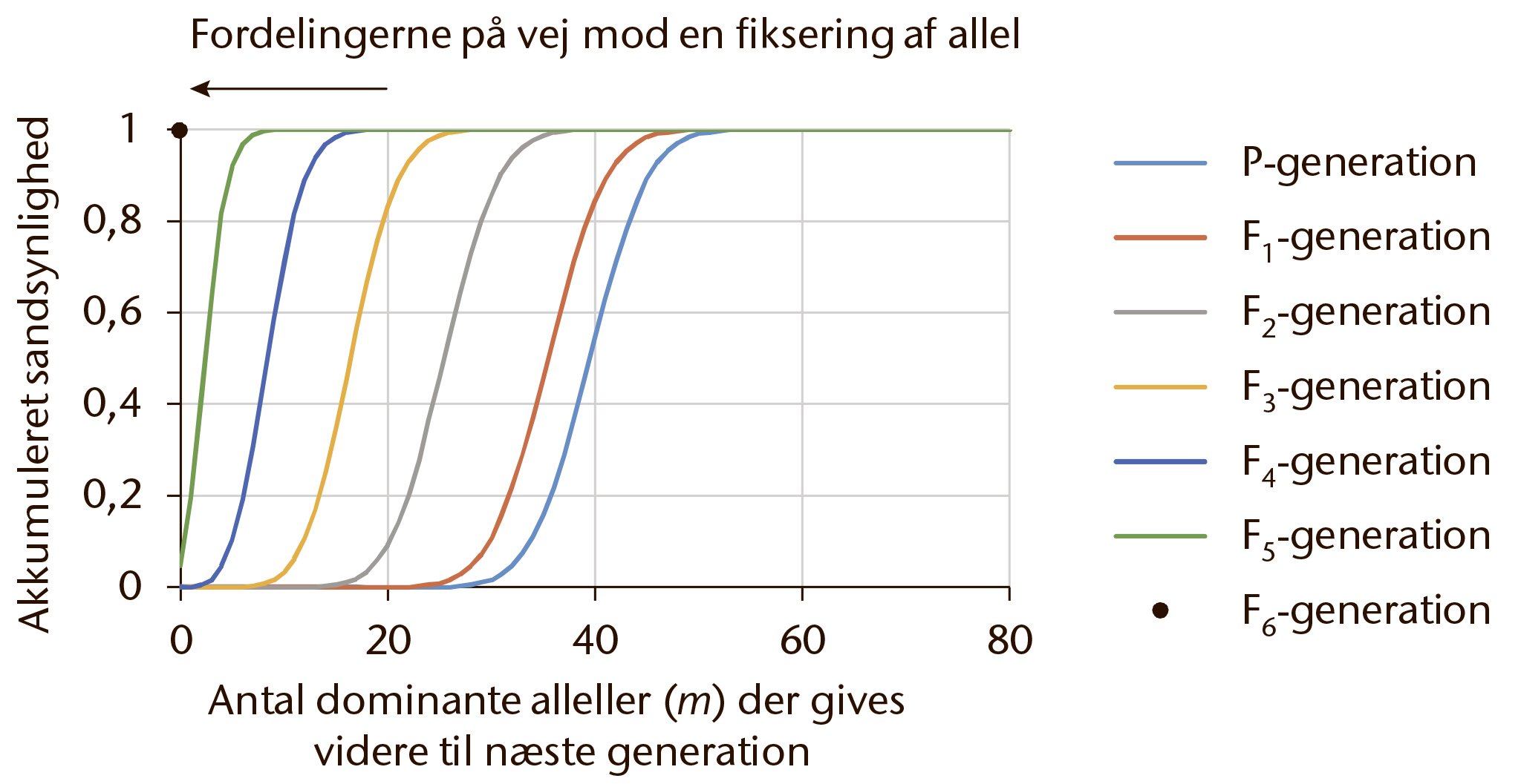 Binomialfordelingskurve der viser genetisk drift over 7 generationer.