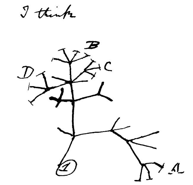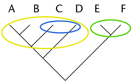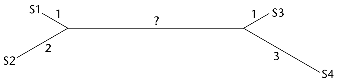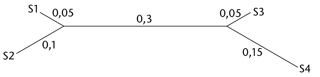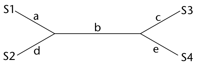 Et hypotetisk stamtræ uden rod og med 4 sekvenser.