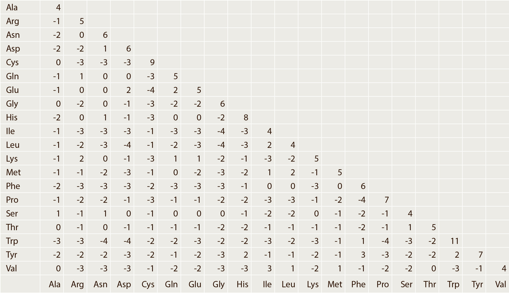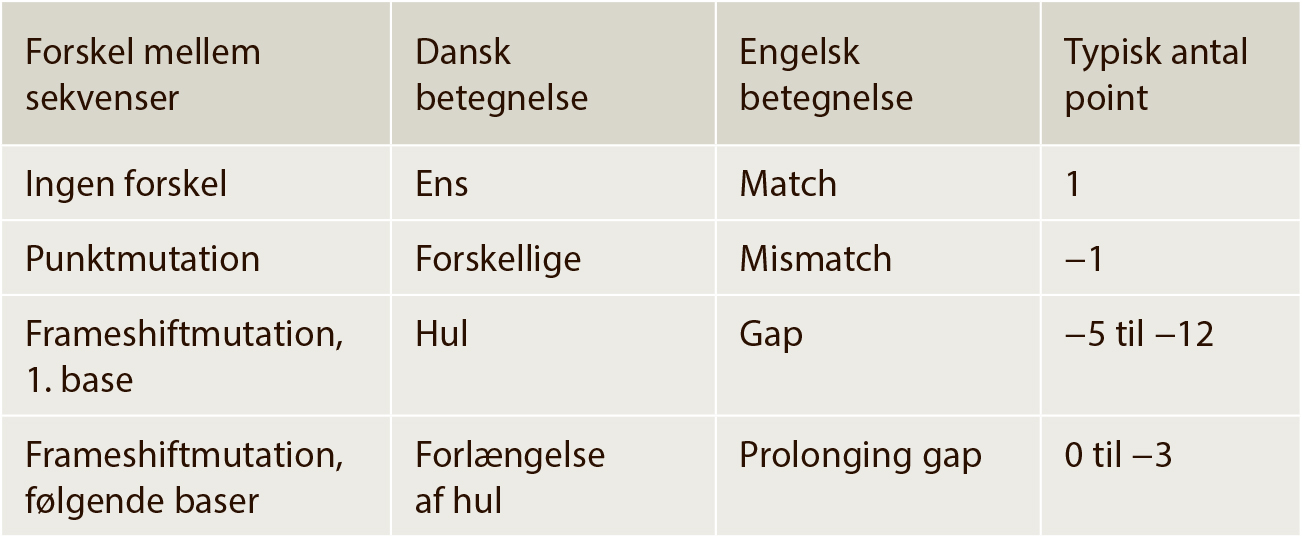 Tabel over mulige værdier som sammenlagt giver en alignmentscore.