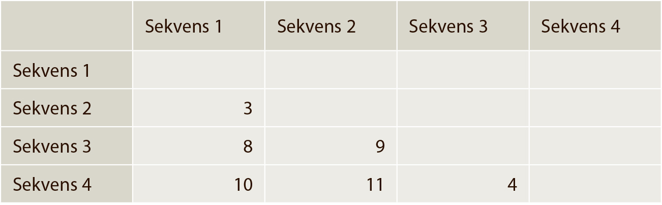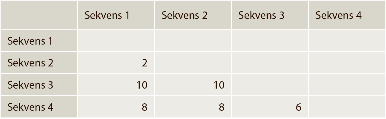 Afstandsmatrix over antallet af forskelle i de viste sekvenser.
