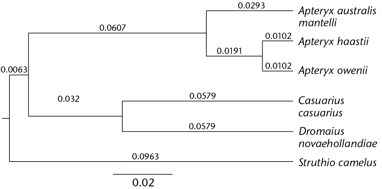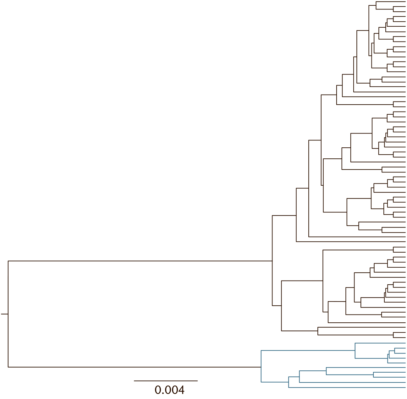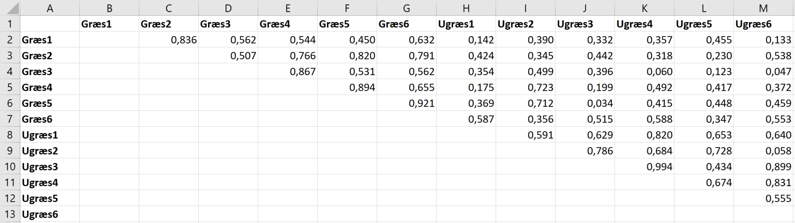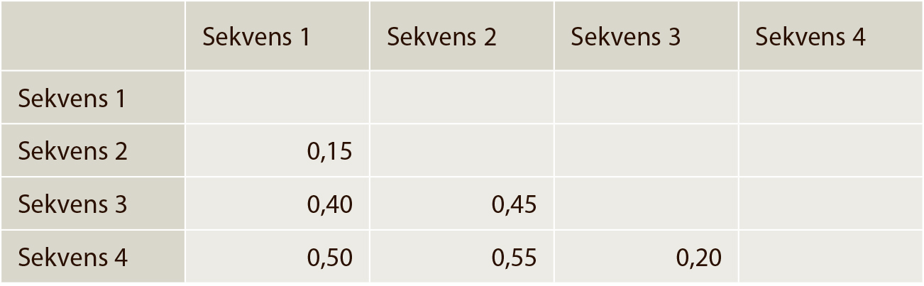 Afstandsmatrix der viser forskelle i de viste sekvenser som andele af sekvenslængden, p-afstande.