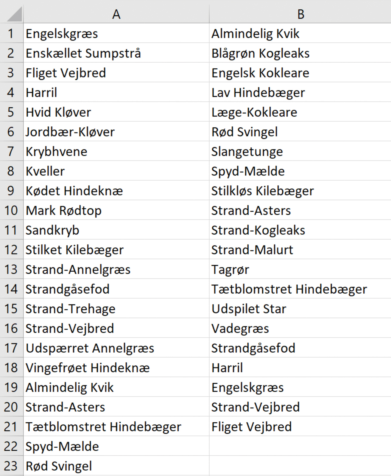 Artslister fra græsset strandeng i kolonne A og ugræsset strandeng i kolonne B.
