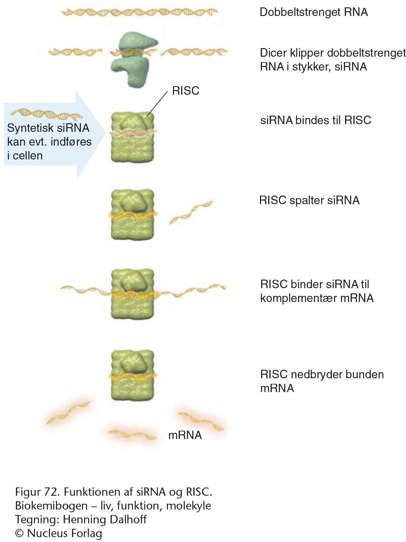 Baggrundsfigurerne for denne animation er figur 54, 55, 56, 57 og 60 i Biokemibogen. Fra cellen zoomes der ind til cellekernen hvor transkriptionen af DNA til RNA sker, hvorefter RNA editeres til mRNA. I cytoplasmaet bliver det færdige mRNA modtaget af et ribosom. Vi ser en proteinsyntese som allerede er i gang, og tRNA’er som svarer til tripletterne på mRNA, kommer med aminosyrerne. Aminosyrerne danner til sidst en lang kæde som foldes til det færdige protein.