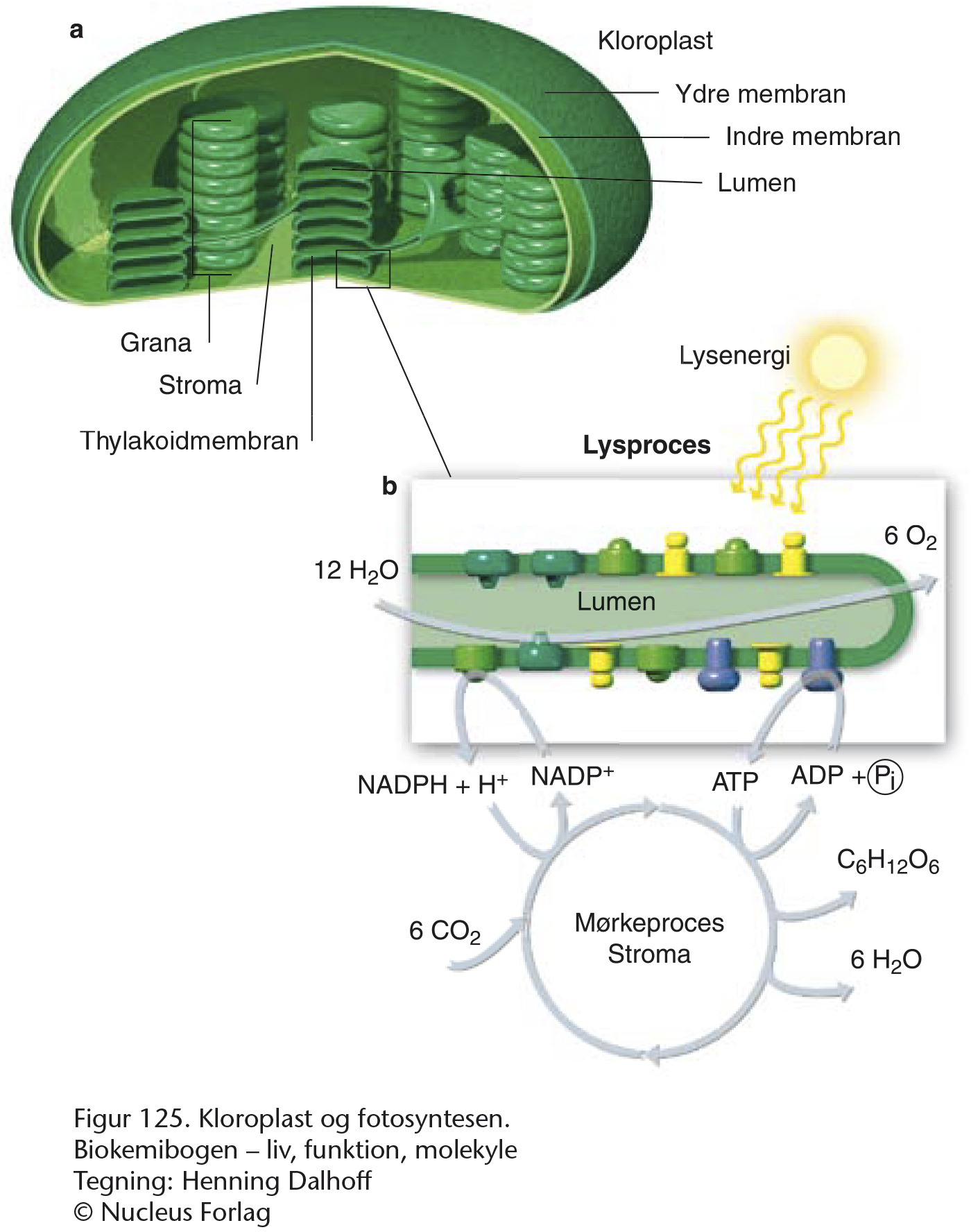 Baggrundsfigurerne for denne animation er Biokemibogens figur 131 og 132. Fra bladet zoomes der ind på kloroplasten hvor fotosyntesen foregår. Vi følger enzymsystemerne i lysprocessen hvor H2O spaltes og O2 frigives som et affaldsstof. Derefter følger vi elektroner og protoner, og undervejs produceres NADPH og ATP til brug i Calvins cyklus.
