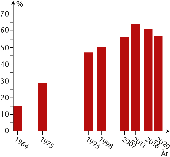 Andelen af voksne danskere (16 år+) der svarer ‘ja’ til spørgsmålet om hvorvidt de dyrker sport eller ej. Kilde: Idrættens Analyseinstitut, 2022.