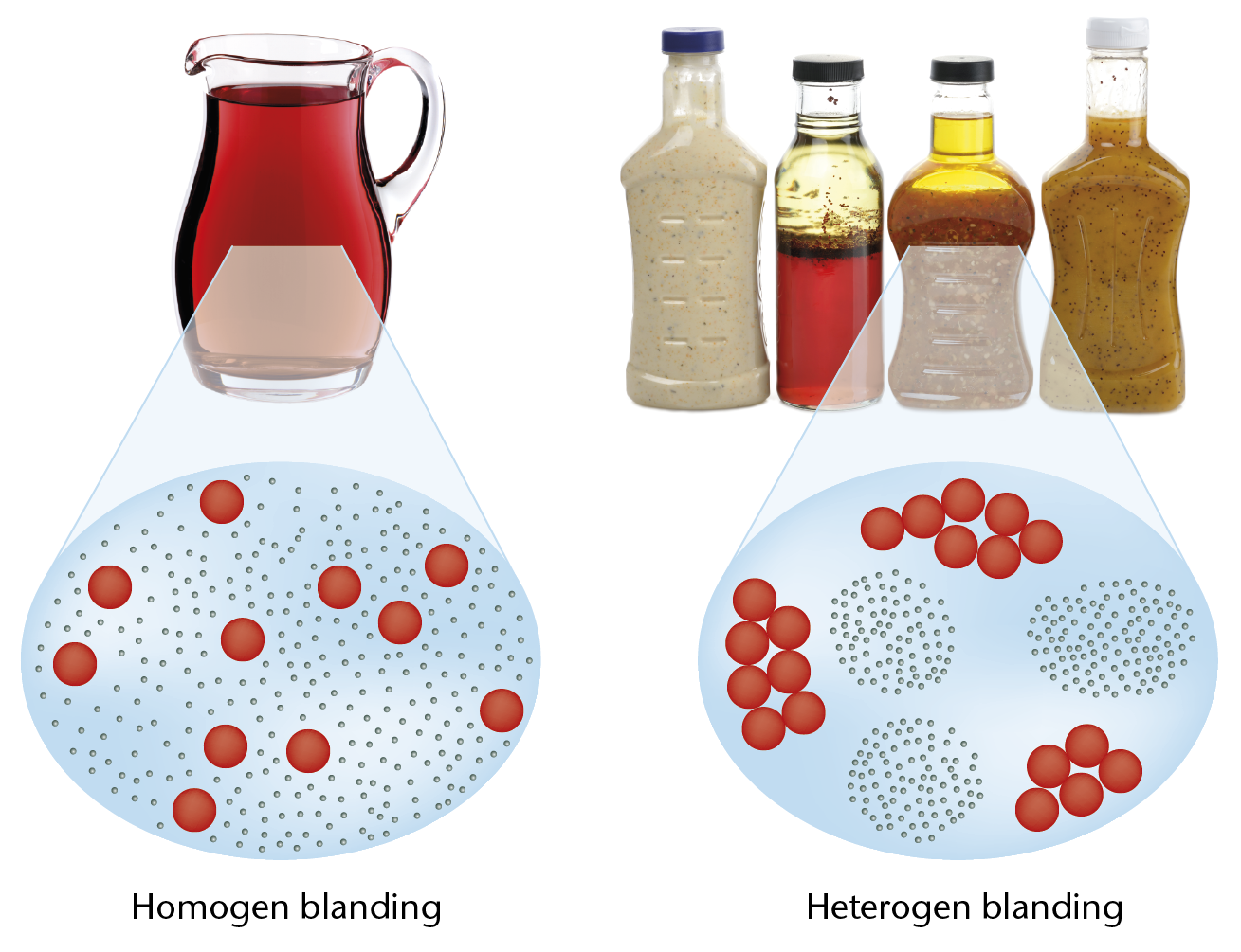 Saftevand og salatdressinger er hhv. honogene og heterogene blandinger.