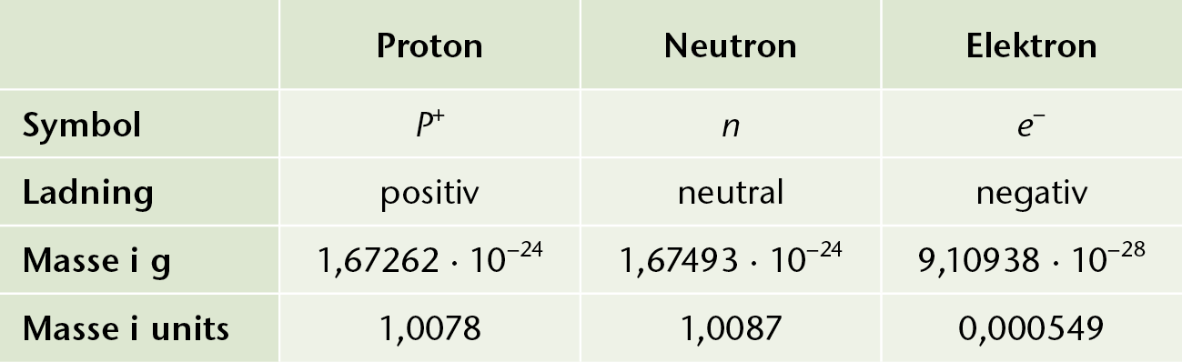 Oversigt og partiklernes ladninger og masser.