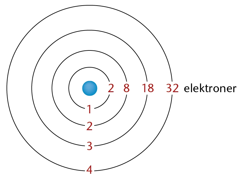 Elektronskaller med angivelse af antallet af elektroner der kan være i hver skal.
