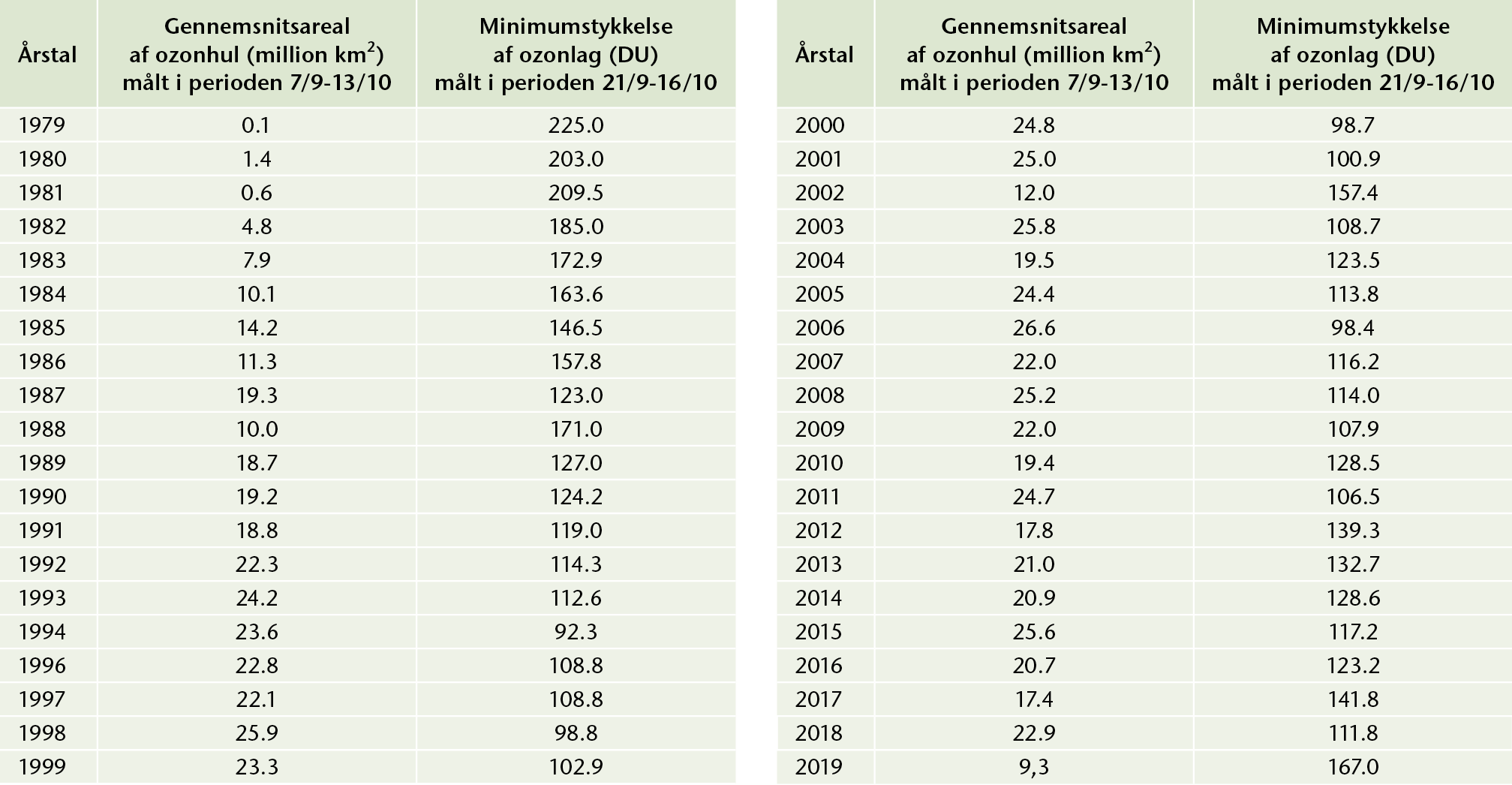 Data for gennemsnitsareal af ozonhul og minimumstykkelse af ozonlag for den sydelige del af jordkloden.