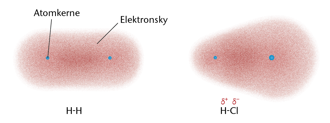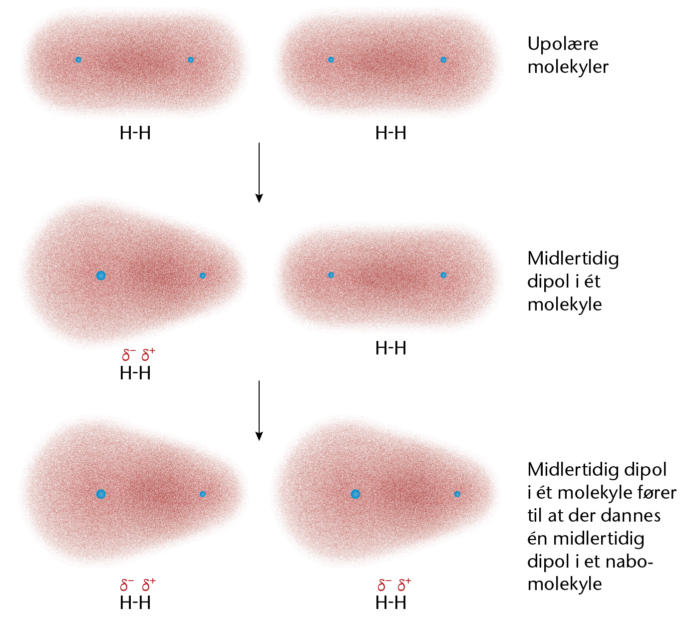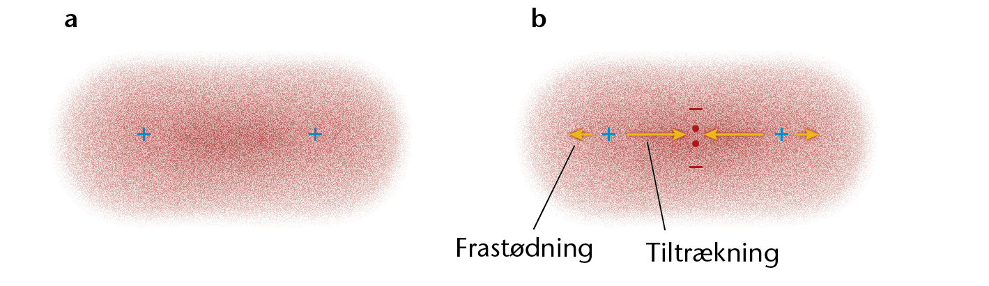 b. Tiltrækning og frastødning mellem elektroner og kerner i et dihydrogenmolekyle.