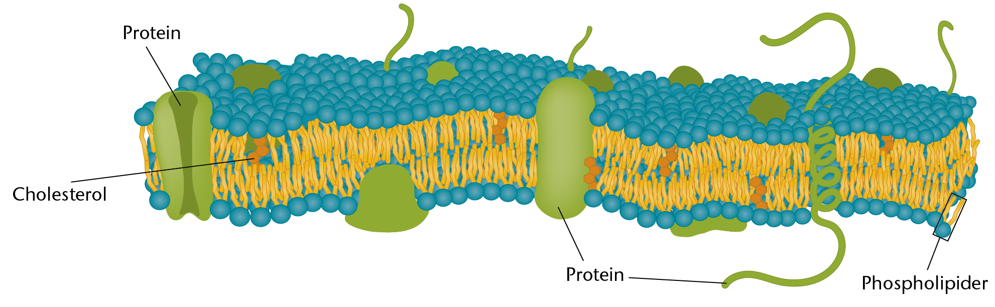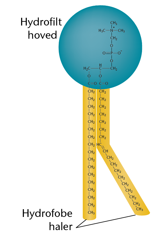 En cellemembran er opbygget af fedtstof, der består af en hydrofob og en hydrofil del.