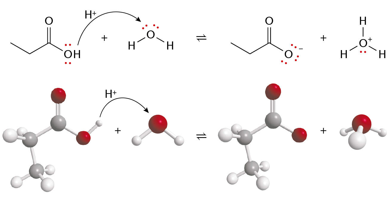 Reaktion mellem propansyre og vand vist med struktur- og elektronprikformler samt med molekylmodeller.