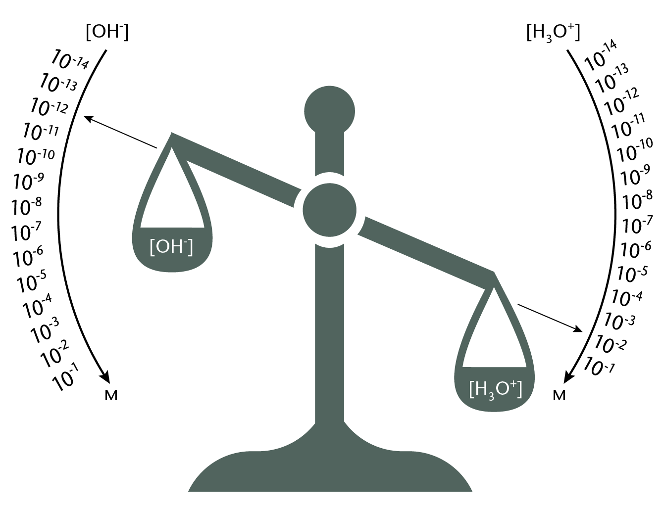 Sammenhæng mellem pH og koncentration af oxonium og hydroxid.