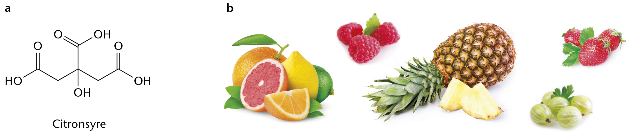 b. Citronsyre er den vigtigste syre i citrusfrugter og ananas, jordbær, hindbær og stikkelsbær.