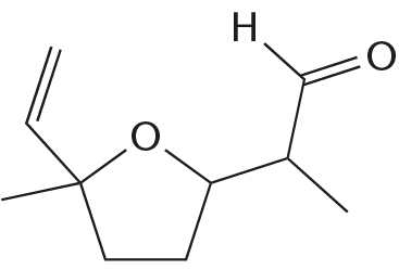 Strukturformel for 2-(5-ethenyl-5-methyloxalan-2-yl)propanal (syrenaldehyd).