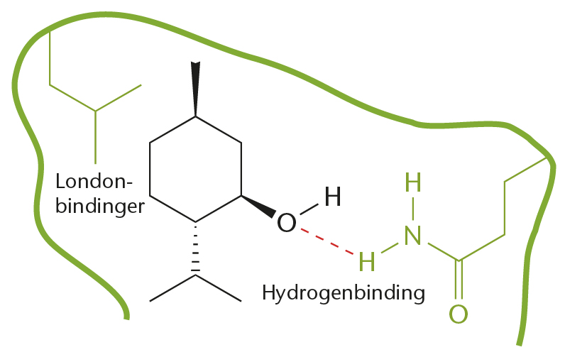 Mulige intermolekylære bindinger mellem L-menthol og aminosyresidekæder.