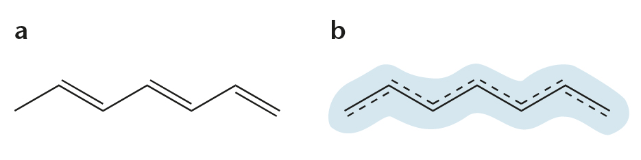 b. elektronerne i de tre dobbeltbindinger er delokaliserede.