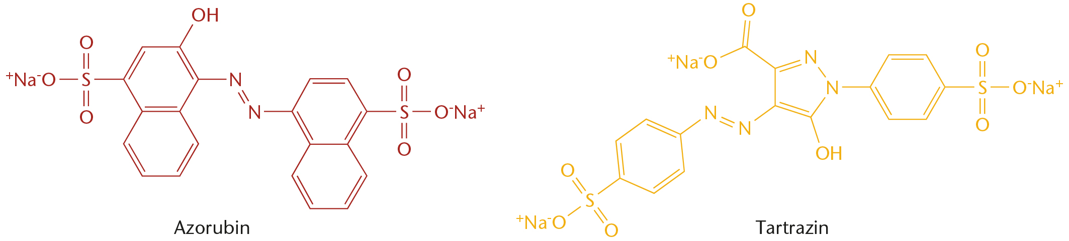 Stregformler for farvestofferne azorubin og tartrazin.
