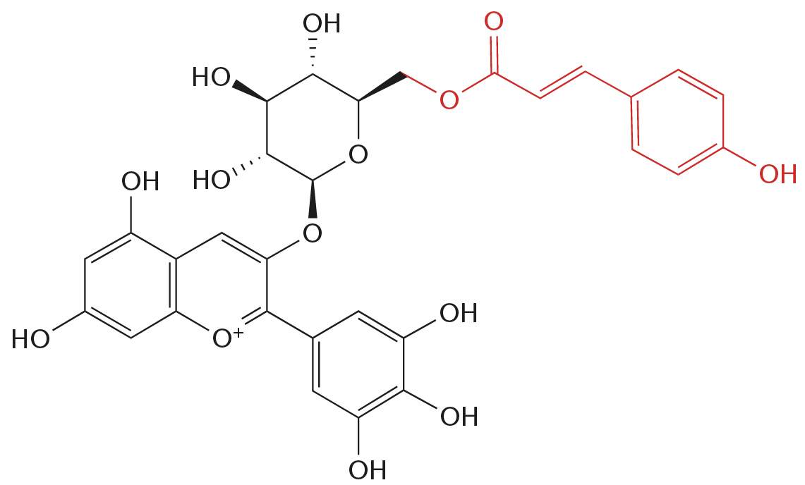 Delphinidin-3-(p-cumaroyl)-glucosid er et acyleret anthocyanin.