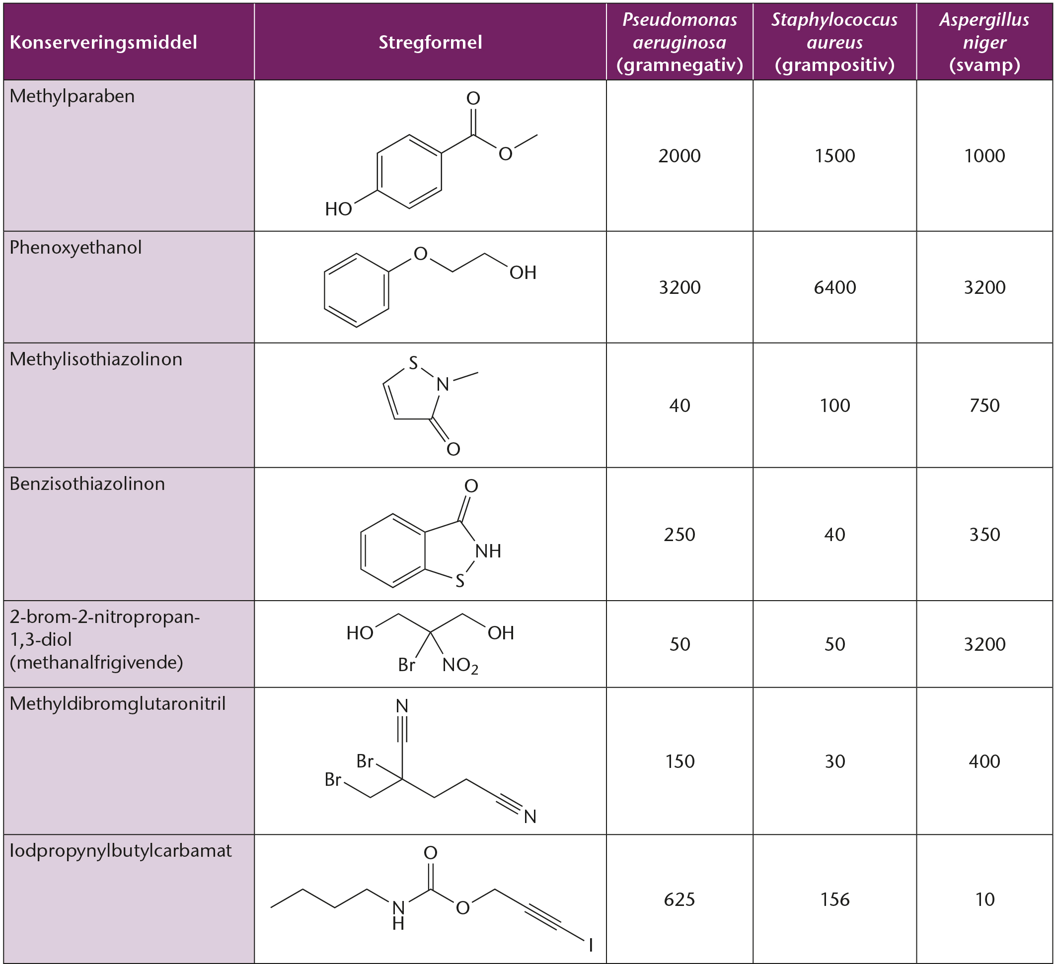 Hæmningseffekt af forskellige konserveringsmidler.