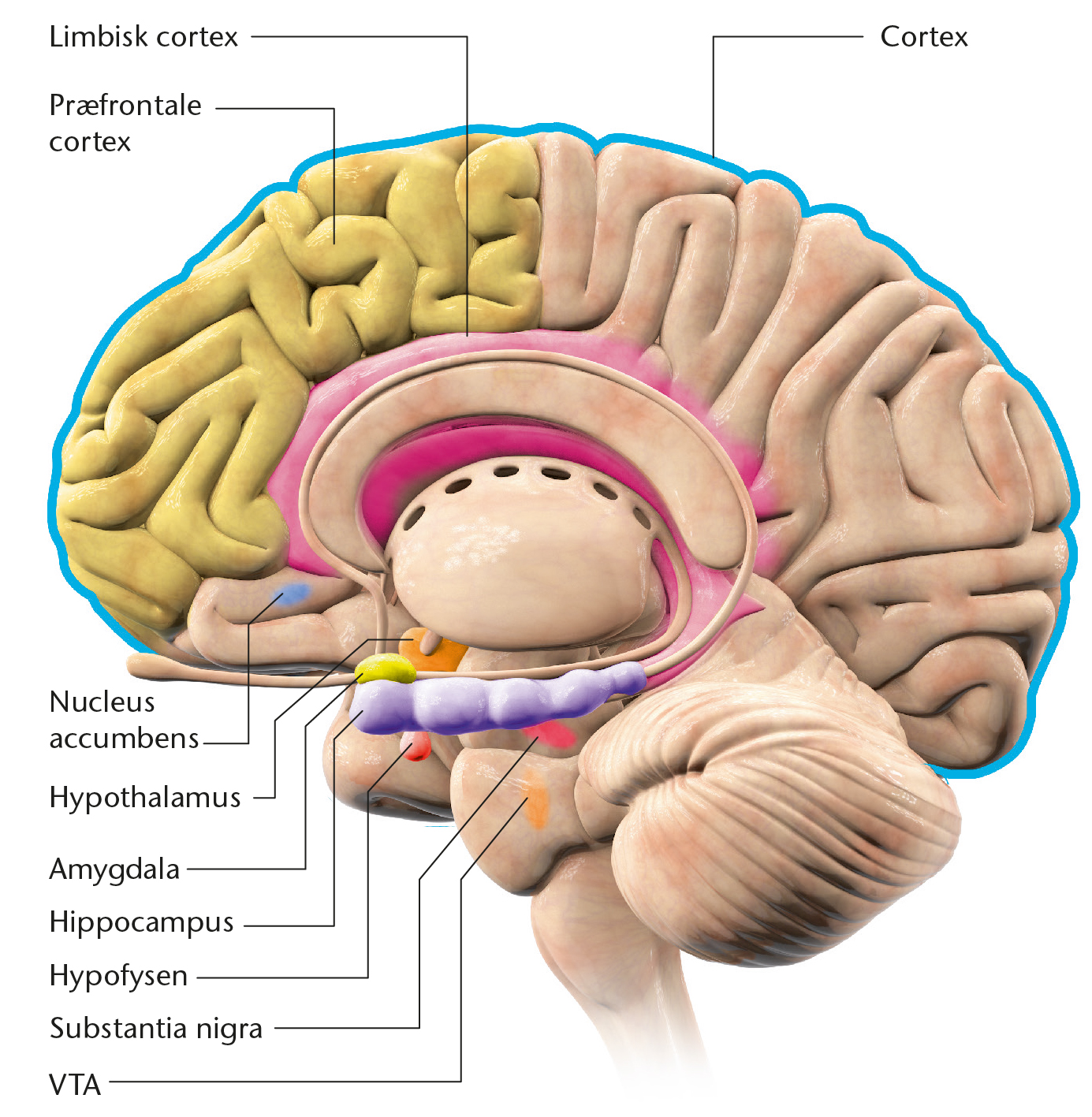 Områder i hjernen der forbindes af dopaminnervebaner.