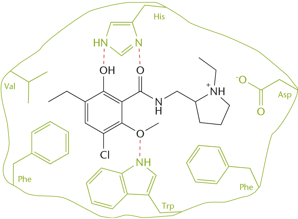 Udsnit der viser eticloprid bundet til aminosyresidekæderne i dopamin D2-receptoren.