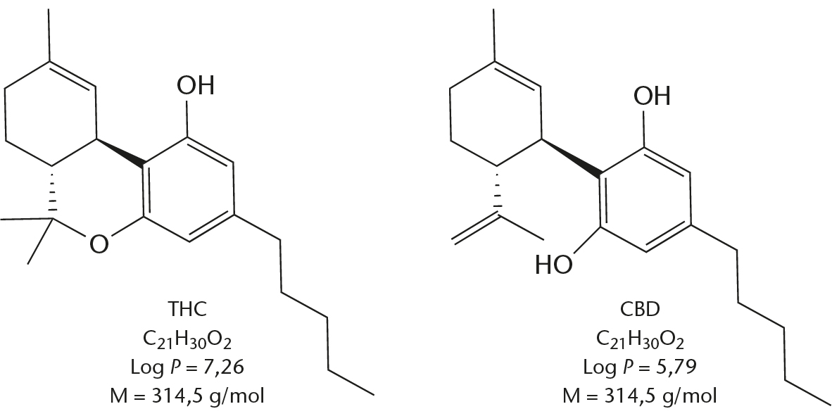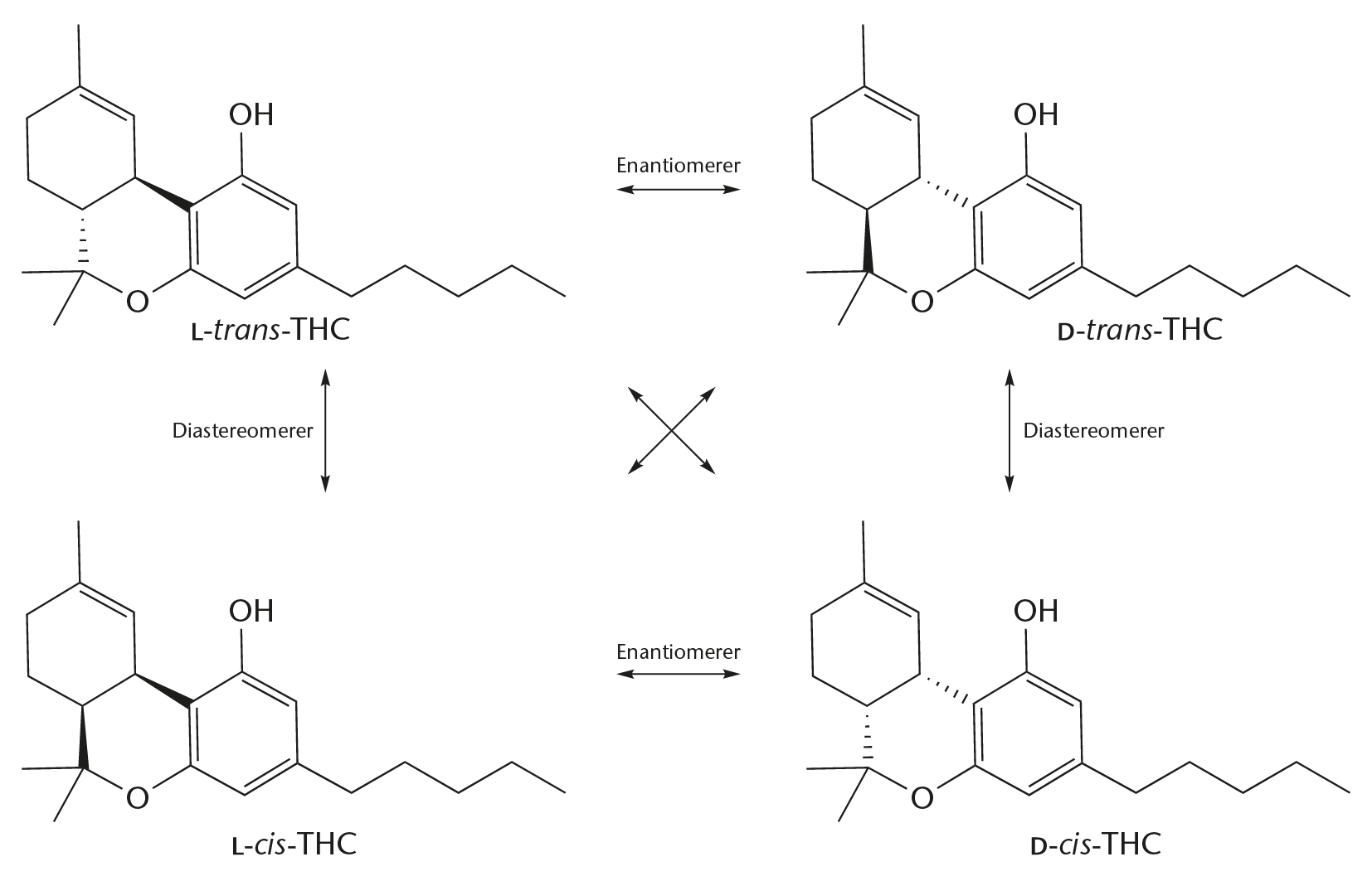 THC findes i fire stereoisomere former som er parvis enantiomerer og diastereomerer.