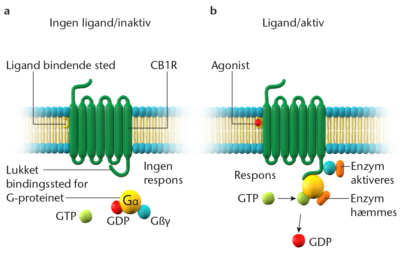 CB1R hvor der i a. ikke er bundet en ligand og i b. er bundet en agonist.
