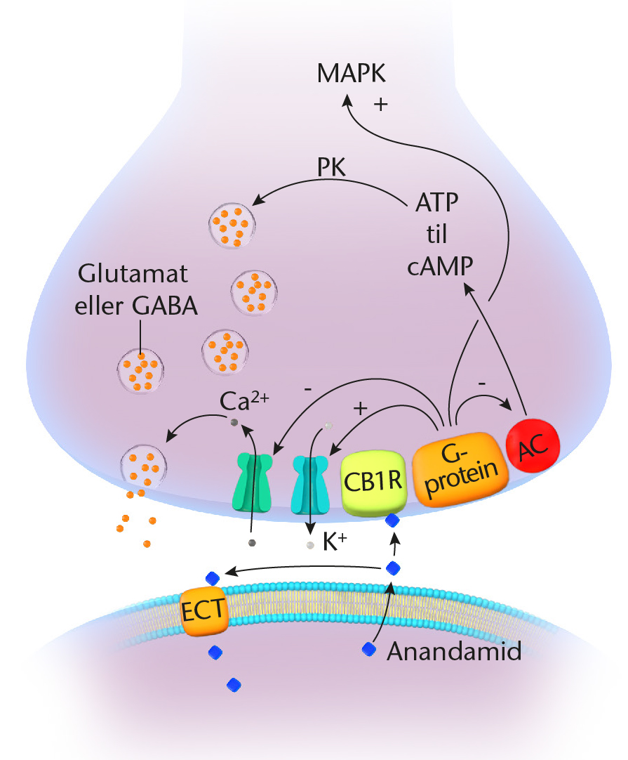 Anandamids binding til CB1R formidsker udskillelsen af transmitterstoffer.