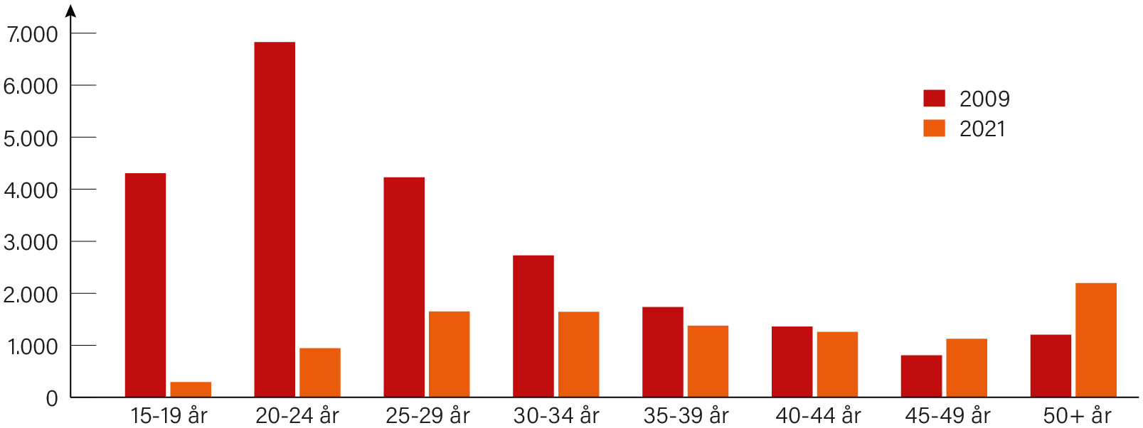Fordeling af påviste klamydiatilfælde i 2021 på køn og alder i de tilfælde hvor køn og alder er oplyst.